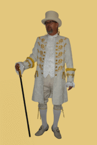 Kostým Ludvík IVX. – bohatě zdobený kabát, bílá košile, vesta a kalhoty pod kolena, které končí zlatými leonskými prýmky. Možnost vypůjčení krásné historické paruky, bílých pánských podkolenek a ozdobných historických přezek na společenské boty. Velikost: 56. Cena za vypůjčení: 370.-Kč