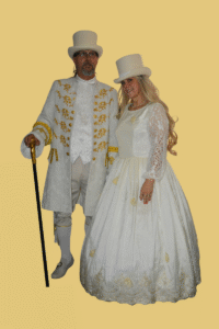 Kostým Největší showman a Principálka – bohatě zdobené kostýmy. Součástí kostýmů jsou luxusní cylindry a pro pána krásná hůlka. Kostýmy lze půjčit každý zvlášť nebo jako párové kostýmy a to za zvýhodněnou cenu. Velikost: dámský 44/46, pánský 52/54. Cena za vypůjčení: 600.-Kč