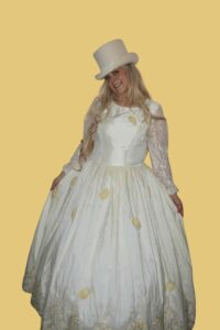 Moudrá královna (Arabela) – manželka krále Hyacinta – kostým z bílého svatebního saténu.Halenka má vzadu zapínání na knoflíky, rukávy jsou nadýchané ozdobené leonskými prýmky, sukně zdobená zlatými kytičkami je na gumu. Součástí je štrasová korunka. Velikost: 42-44. Cena za vypůjčení: 300.-Kč