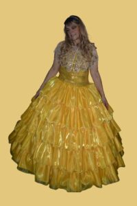 Kostým Kráska Bella– nádherné jasně žluté taftové šaty zdobené kamínky v kombinaci s organzou a s flitrovým pružným živůtkem, součástí kostýmu je lurexová pelerína lemovaná boa, dlouhé rukavičky, psaníčko, šperky a spodnička. Velikost: 38. Cena za vypůjčení: 400.-Kč