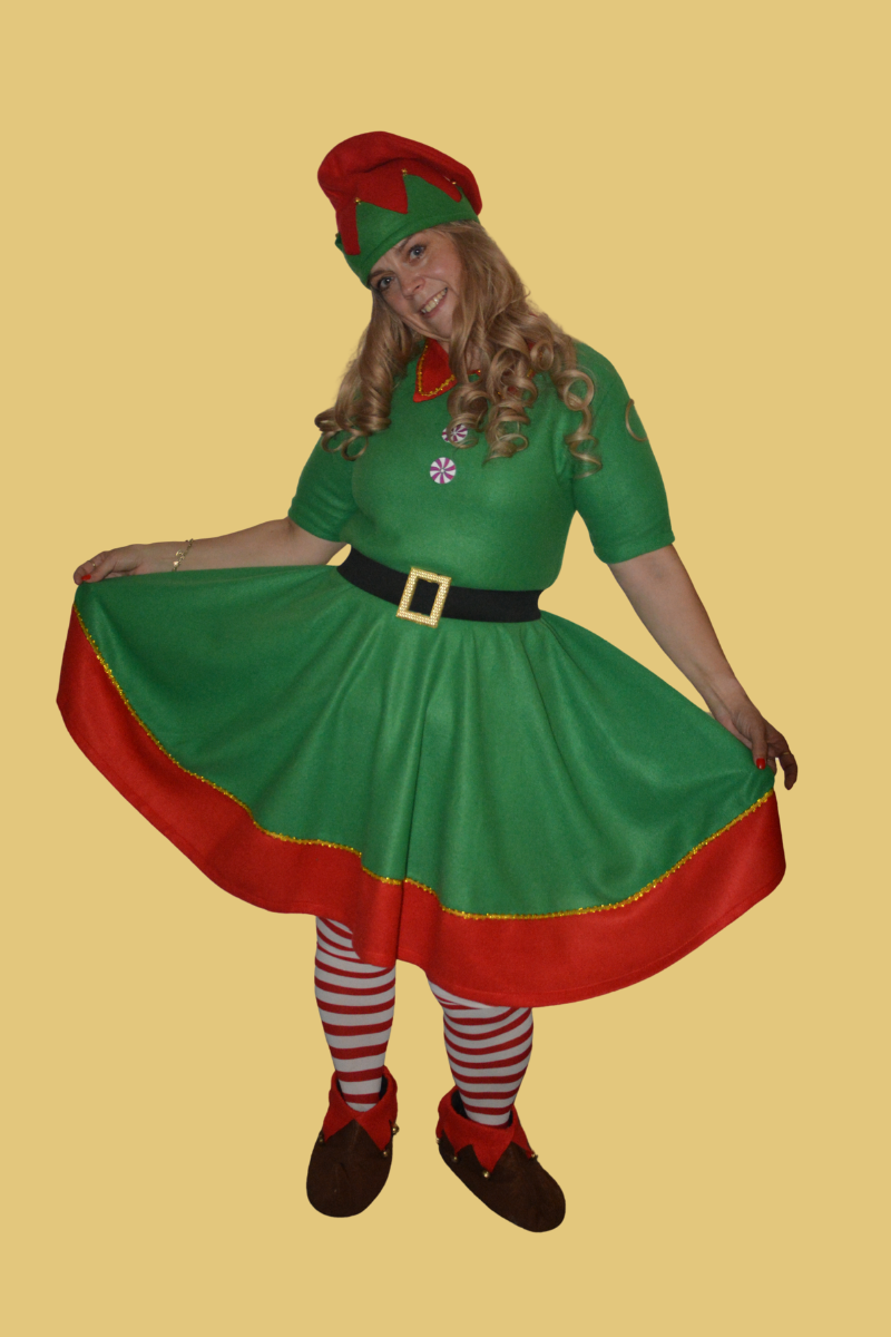 Kostým Elfí skřítek (dámský) – jsou krásné šaty s dlouhými rukávy. Dole na rukávech, u krku a u dolního okraje zakončené červenými zubatými lemy. Součástí je elfí čepka s rolničkou, pásek, pruhované punčocháče a botičky s rolničkami Velikost: 38. Cena za vypůjčení: 280.-Kč